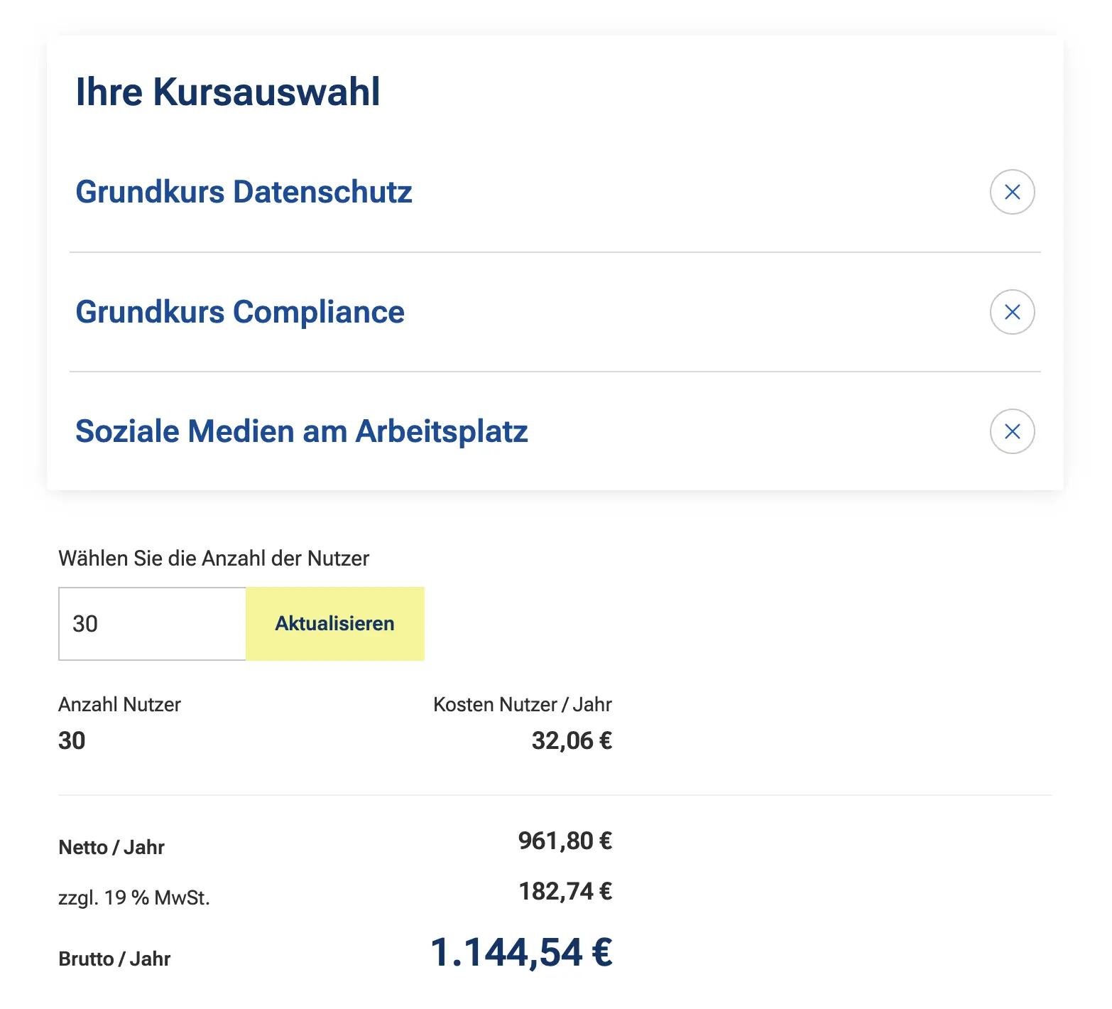 Ein von uns entwickeltes shopware Plugin stellt in der Preisübersicht und direkt im Warenkorb die korrekte Berechnung in Abhängigkeit von Anzahl der Nutzer und Kurse sicher.