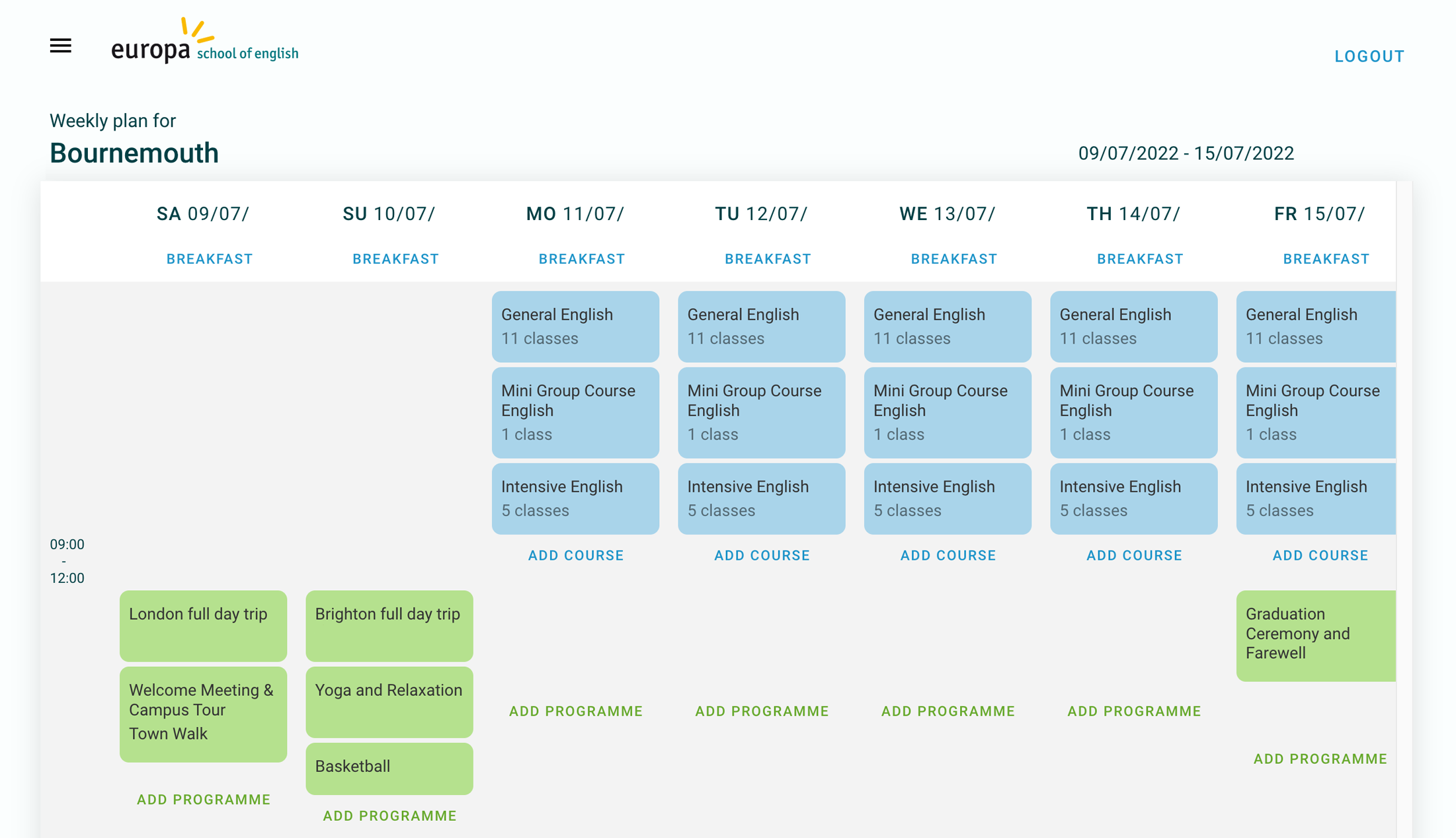 Zentraler Bestandteil der App ist ein internetbasierter Wochenplan mit detaillierten Unterrichtsplänen und Freizeitangeboten. Dieser Wochenplan zeigt jedem Sprachschüler, wann und wo sein Unterricht stattfindet. Über personalisierte Zugänge kann er sich außerdem für außerschulische Freizeitaktivitäten registrieren lassen.