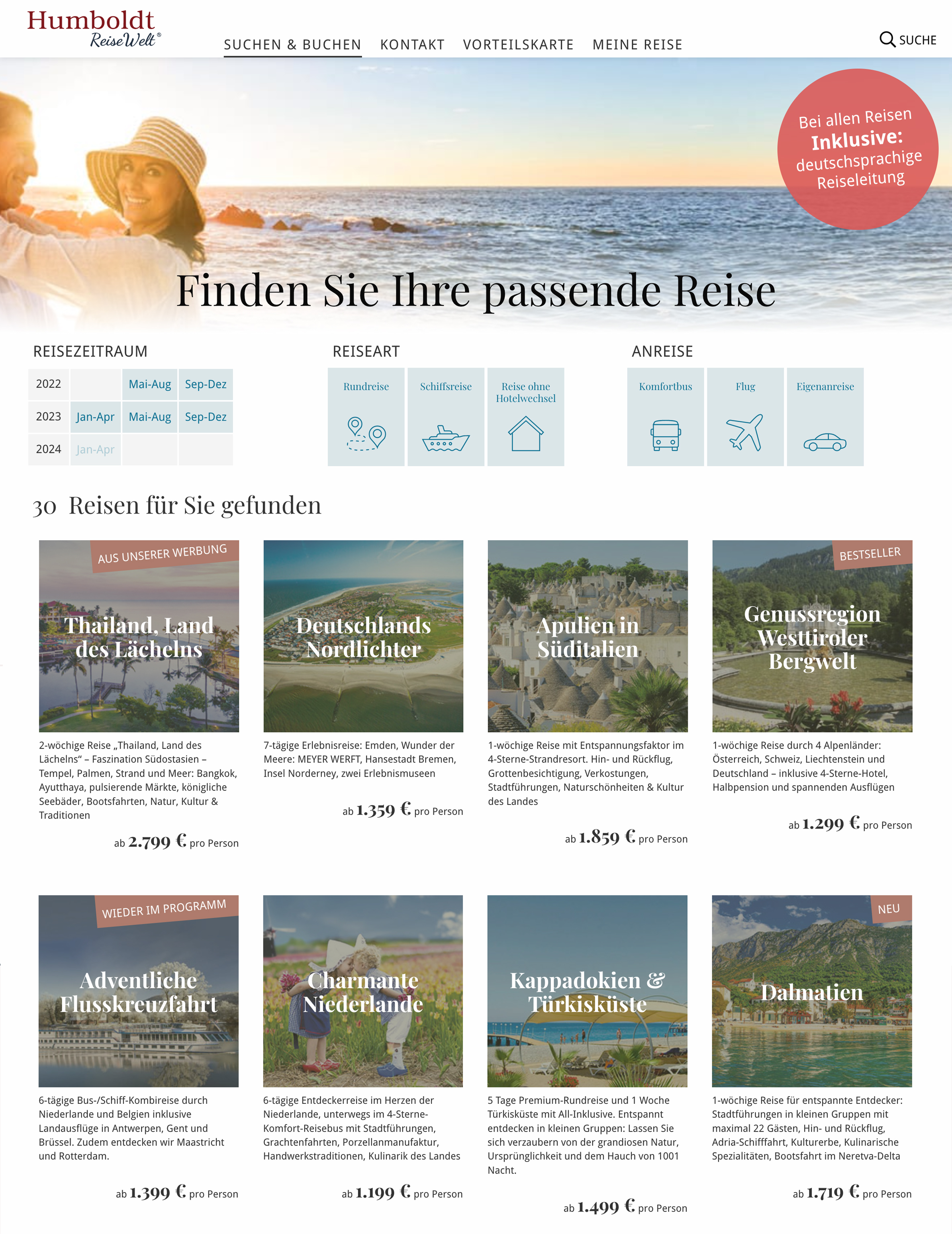 Unser Hauptaugenmerk galt hier der Reduktion von Komplexität und einer klaren Benutzerführung. Dafür haben wir eine Informationsarchitektur entwickelt, die es Nutzern gestattet, gemäß ihren Präferenzen (Reisezeitraum, Reiseart, Anreise) die passende Reise zu finden. Gelungen ist uns das mit Hilfe einer ausgeklügelten Filterlogik, die mit wenigen Klicks eine trennscharfe Auswahl an Reisen liefert.