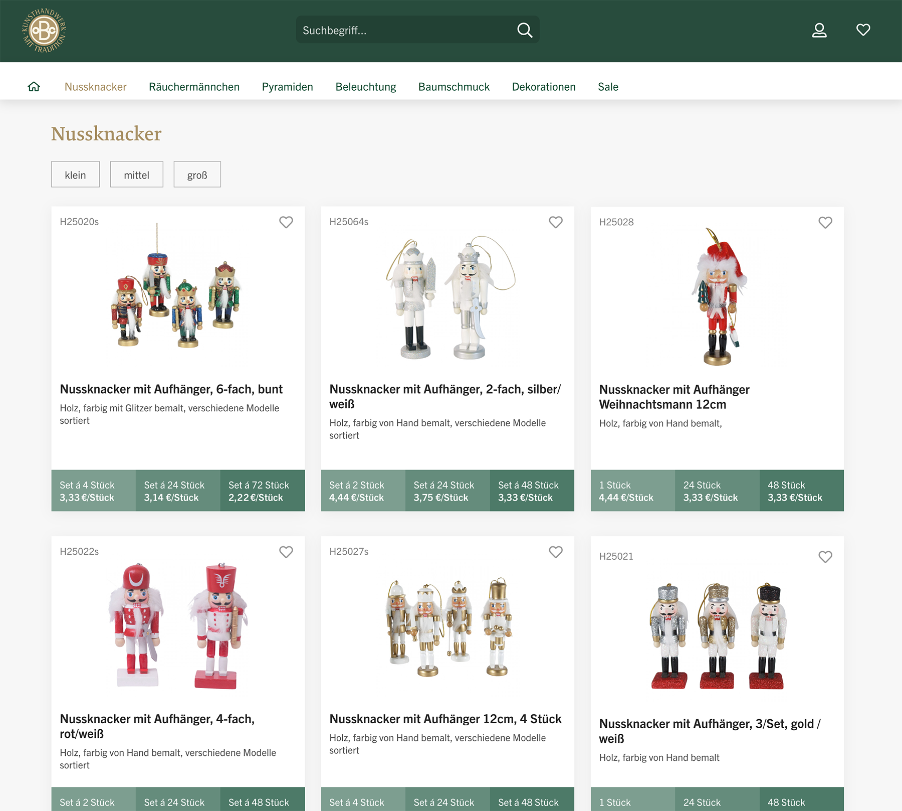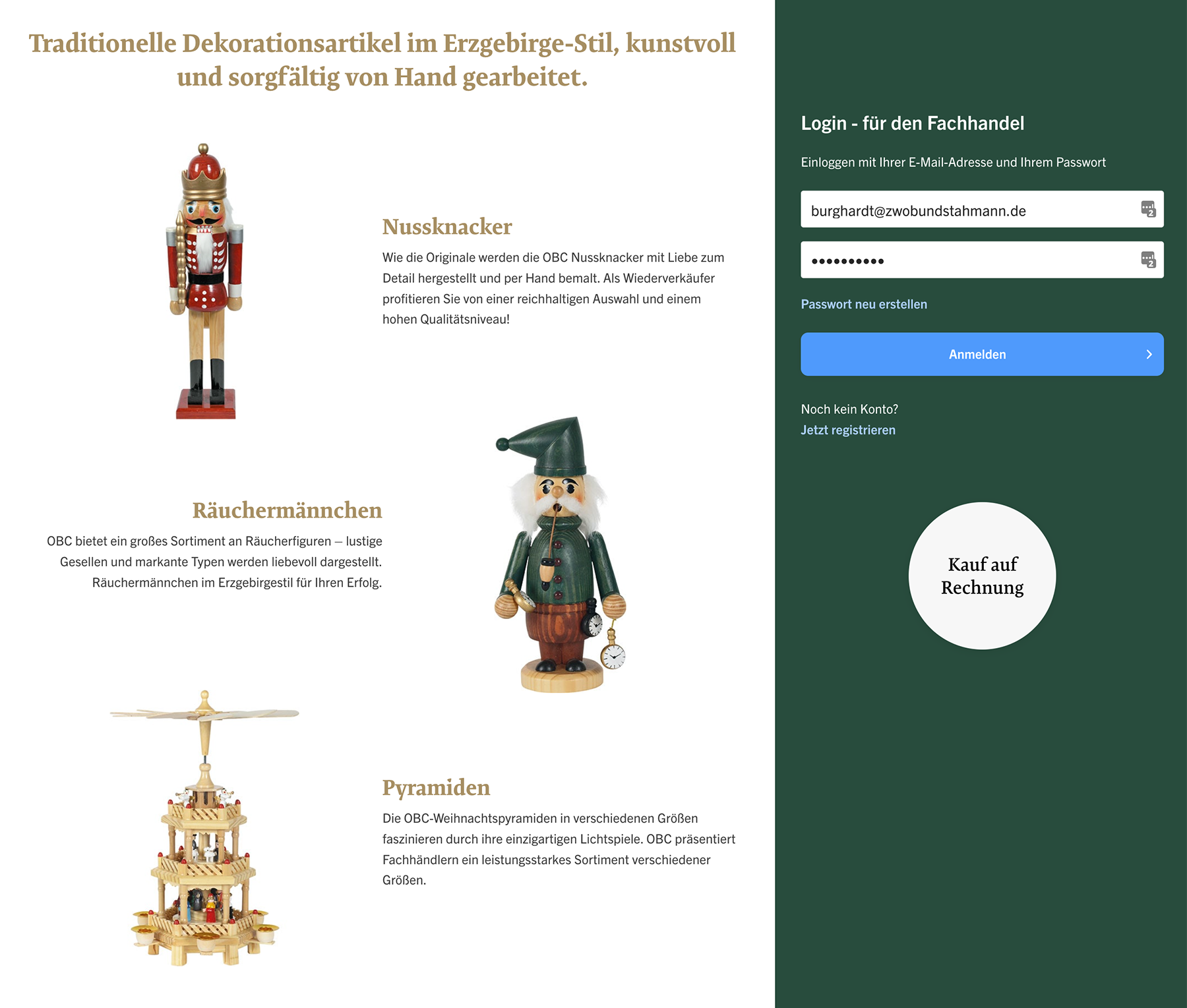 In diesem Onlineshop können sich registrierte Standbetreiber von Weihnachtsmärkten mit traditonellen Dekorationsartikeln (Nussknacker, Räuchermännchen, Baumschmuck etc.) im Erzgebige-Stil versorgen. Die Website basiert auf dem Online-Shopsystem shopware.