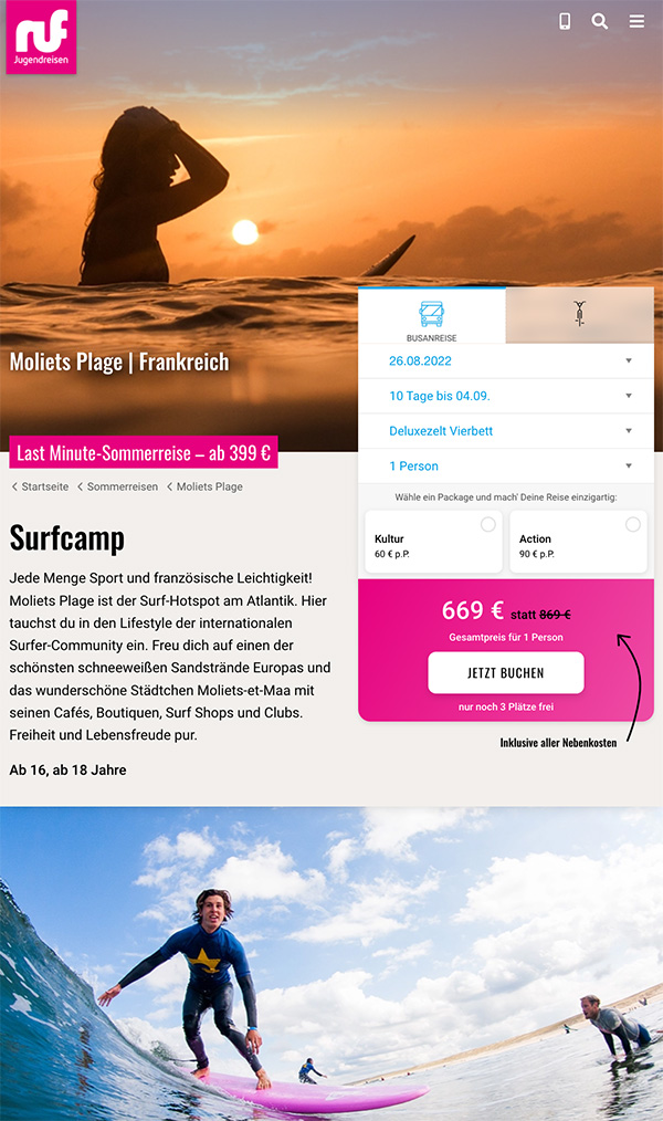 Wir haben eine Ansicht entwickelt, die dem Nutzer en passant zeitliche Verfügbarkeit und Preis offeriert, ohne dass er sich mühsam durch Preis- und Saisontabellen durcharbeiten muss. Mit wenigen Klicks können buchungsrelevante Parameter variiert werden - ohne das eigentliche Ziel aus den Augen zu verlieren. Joy of Use = increasing booking numbers