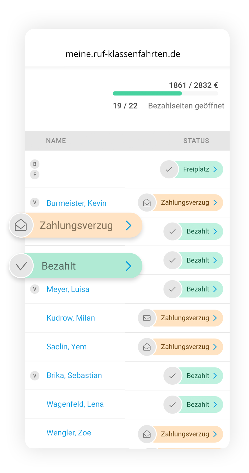 Mit diesem Service nimmt der Reiseveranstalter dem Anmeldenden - i.d.R. dem Lehrer bzw. der Lehrerin - die komplette Zahlungsabwicklung ab, inkl. eventueller Zahlungserinnerungen. In einer übersichtlichen Darstellung ist der aktuelle Zahlungsstatus der Schüler immer sichtbar.