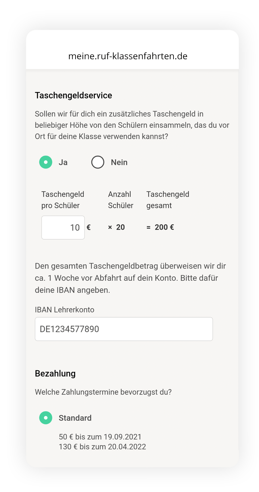 Mit diesem Service lässt sich zusätzliches Taschengeld in beliebiger Höhe vorab einsammeln, welches das Lehrpersonal dann für seine Klasse vor Ort einsetzen kann. Der gesamte Betrag wird etwa eine Woche vor Abfahrt überwiesen.