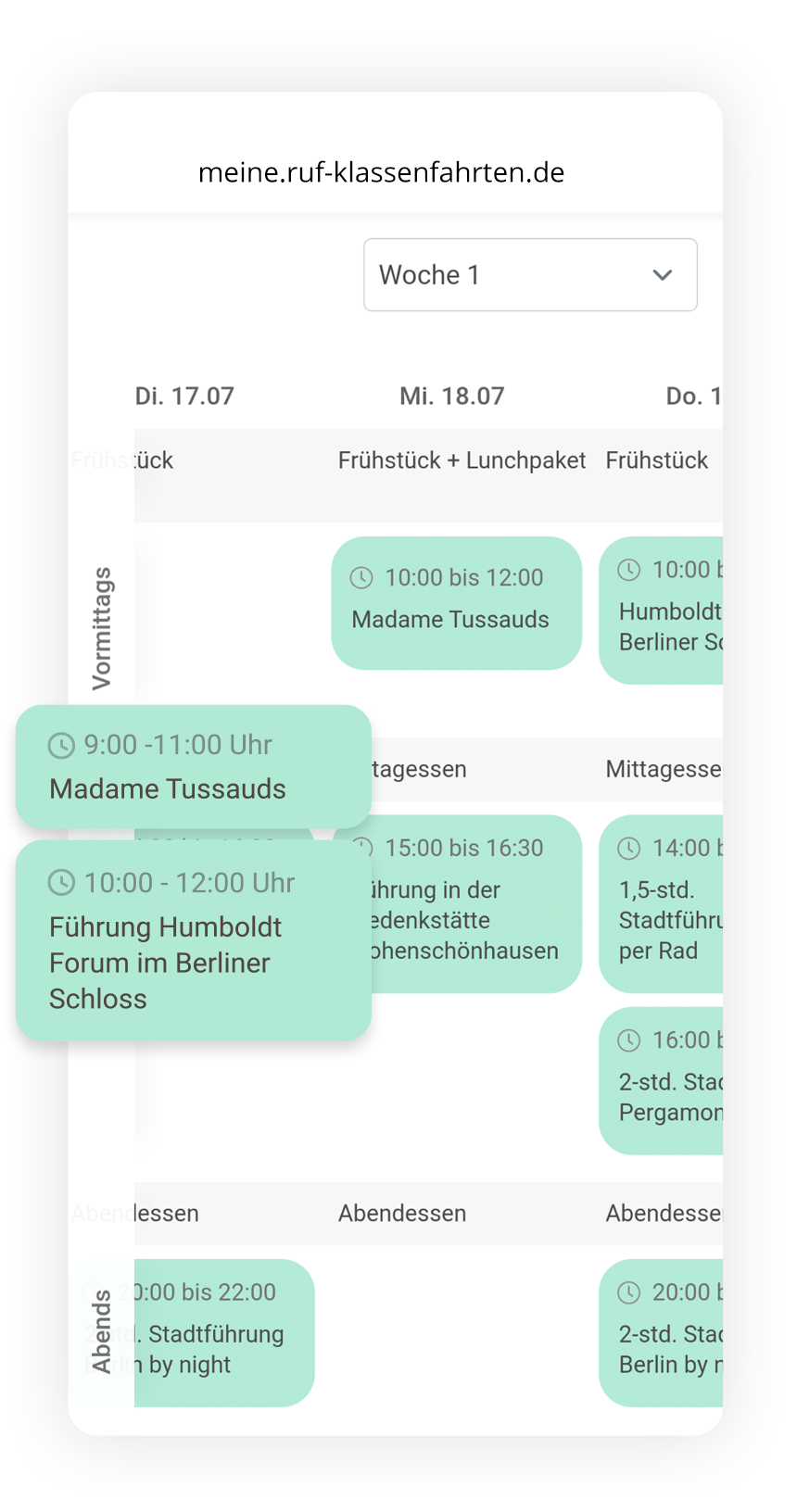 Im Klassenfahrten-Ordner befindet sich ein ausgearbeiteter Reiseplan, der alle Aktivitäten, Besuchszeiten, Mahlzeiten u.v.m. enthält. Als PDF kann er an alle Teilnehmenden und/oder deren Eltern versendet werden.